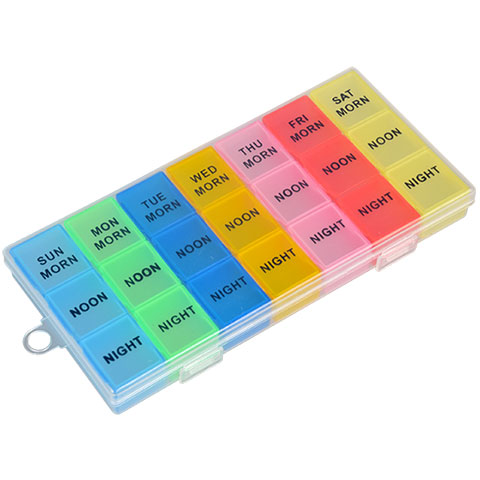 PILL BOX WITH THREE COMPARTMENT DAILY, IN DIFFERENT COLOR, EACH DAY SEPARABLE, "MORNING, NOON, NIGHT", 17.8X8.3X2.1CM