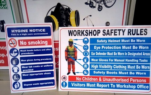 WORKSHOP SAFETY SIGNAGE – A2 size All weather Safety signage made of Aluco Board material and Vinyl branding Wall mountable using screws or still nails. 400mm by 300mm