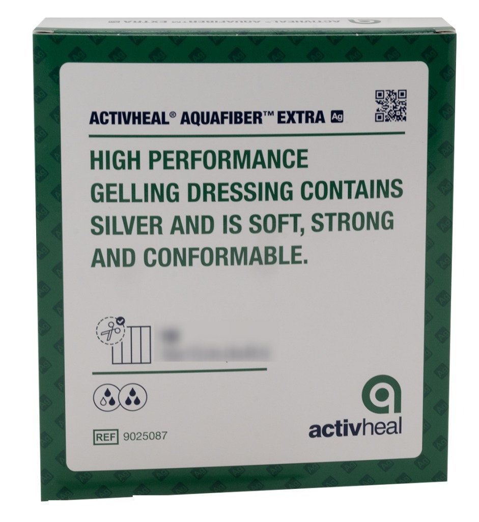 • ActivHeal® Aquafiber™ Extra Ag antibacterial dressing is an innovative combination of two proven wound care technologies based on CMC & alginate fibers consisting of a high G (guluronic acid) calcium alginate and carboxymethylcellulose (CMC), and a silver compound. A hidden integrity layer in the dressing supports the tensile performance.