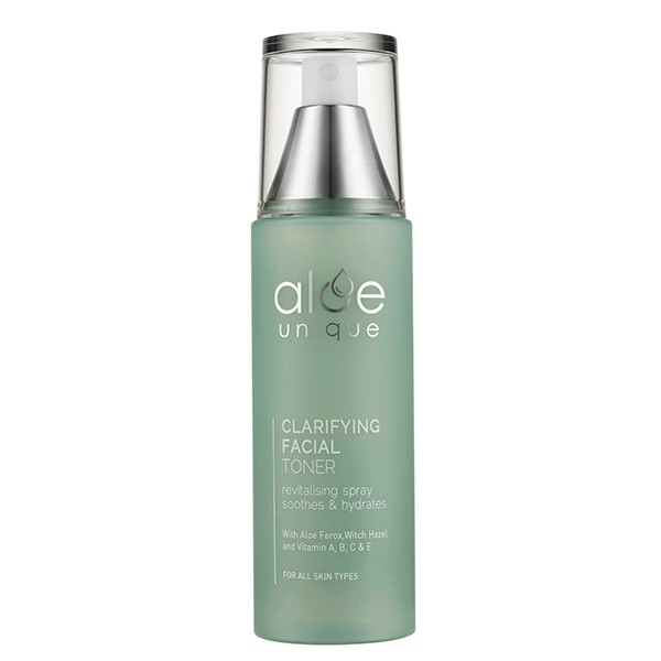 Aloe Unique Clarifying Facial Toner revitalizes, soothes and hydrates skin. It clarifies blemishes, tones and tightens pores and calms reactive skin with purifying Witch Hazael anti-irritant, allantoin and powerful anti-oxidant. This Aloe Ferox based formula leaves skin refreshed and clear.