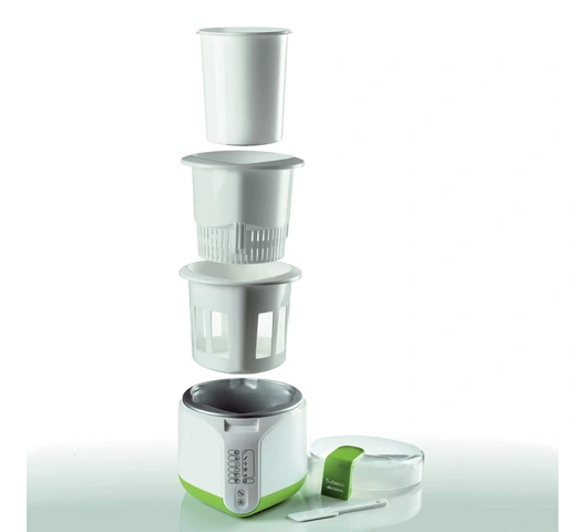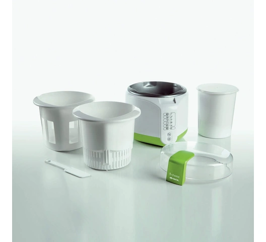 Complete accessory set – Cheese basket, Greek yogurt basket, yogurt container with lid, and spatula included.
