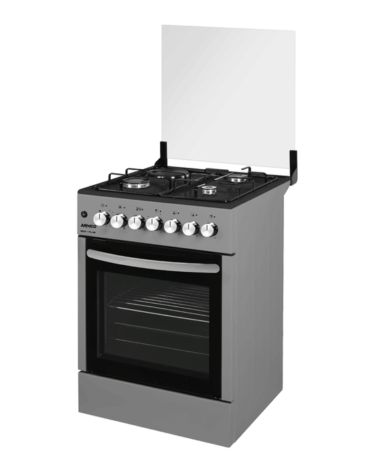 ARMCO GC-F5831PX(SL) - 3Gas+1Electric, 58X58 Oven+Grill, Button iginition, Thermostat, Lamp, Glass Lid, Mechanical Timer, Double glass Oven Door, 1 grid, 1 Tray, 1 Round Tray, Adjustable Feet, Silver.