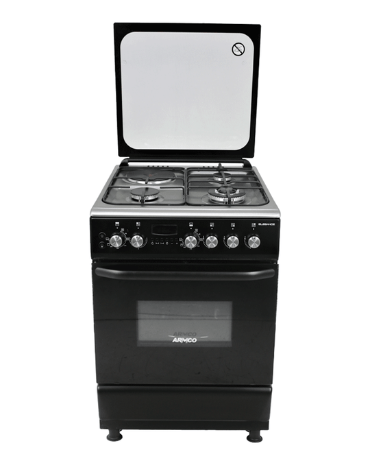 ARMCO GC-F6631LX3(BK) - 3Gas+1Electric, 60X60 Full Convection Oven+Grill, 1 WOK, 1 Rapid HP(180mm), One Touch Auto ignition, Flame Failure Device, Thermostat, Lamp, Glass Top Lid, Rotisserie, Digital Timer, High Aesthetics Steel Knobs, Black.