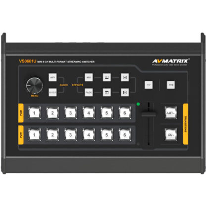 You can output multiview layouts via USB Type-C, HDMI, and SDI that show preview, program, and input sources, all on the same screen with configurable PiP functionality. The VS0601U features four 3G-SDI and two HDMI inputs that can be connected to cameras or other consumer or professional sources for switching up to 1080p60 video with embedded audio. You can also mix the audio using the analog stereo 2RCA and 3.5mm inputs and outputs along with the embedded audio.