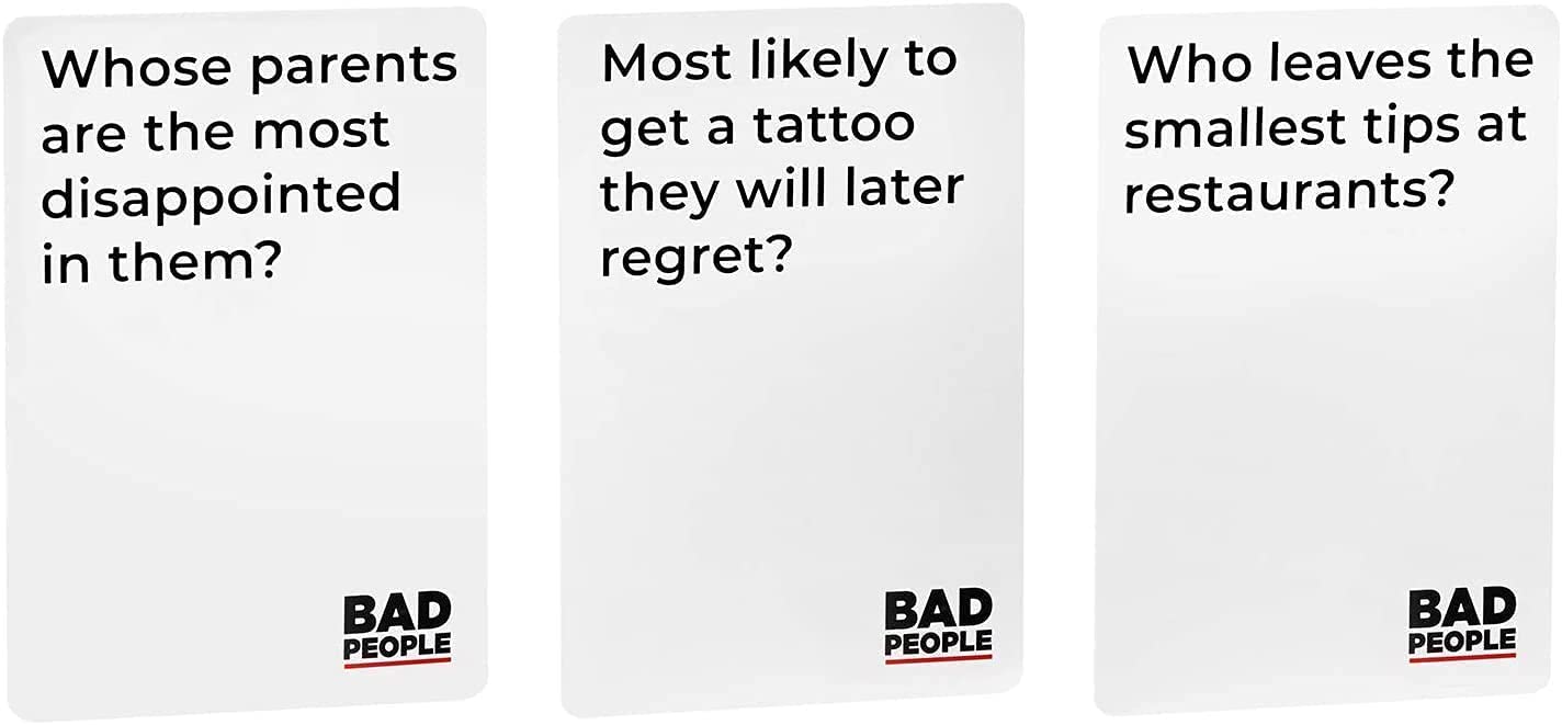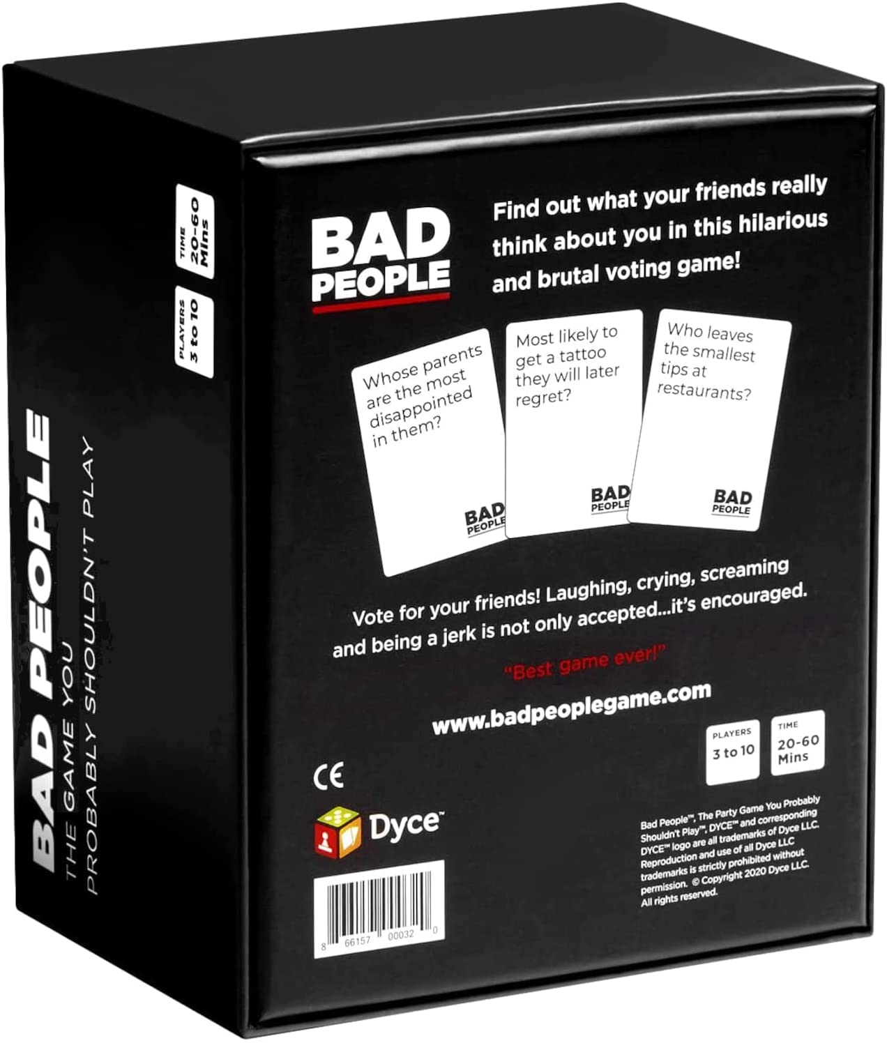 - VOTING FOR YOUR FRIENDS IS HILARIOUS AND YOU CAN PLAY BAD PEOPLE 1000's OF TIMES: The gameplay changes each time based on who you are playing with. Ages: 15+, Time: 20-60 Minutes, Players: 3-10.