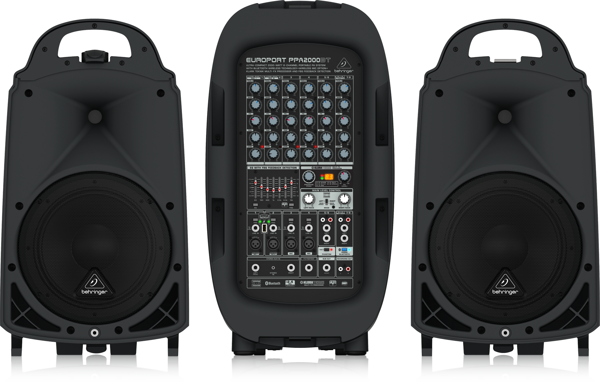 The EUROPORT PPA2000BT packs amazing power and sound quality into a compact, portable suitcase-style PA system – that’s fast and easy to set up. The PPA2000BT’s integrated 8-channel mixer has enough inputs for 4 microphones, 2 musical instruments, your favorite MP3 player and more – making it ideal for parties, schools, corporate and educational presentations, working musicians and even weddings. Built-in Bluetooth connectivity allows you to stream music from your smart-phone, tablet or other Bluetooth-equipped device. Best of all, the PPA2000BT is “wireless ready” for our high-quality ULM Series digital microphones, so you can become completely mobile. This powerful, 2,000-Watt marvel also features the crème de la crème of professional vocal effects from world-famous KLARK TEKNIK – and our amazing FBQ Feedback Detection System for the ultimate freedom from feedback. We’ve even included a high-quality microphone, and all the cables and accessories you’ll need, so you’re ready to go – right out-of-the-box!