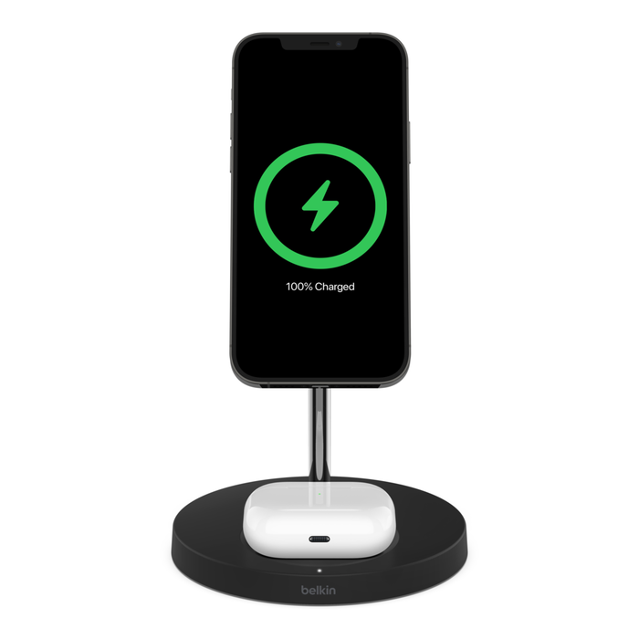 It’s easier than ever to keep your Apple essentials charged. Below the 15W magnetic wireless charging stand for your Apple iPhone 14/13/12 series device is a wireless charging pad optimized for your Apple AirPods.