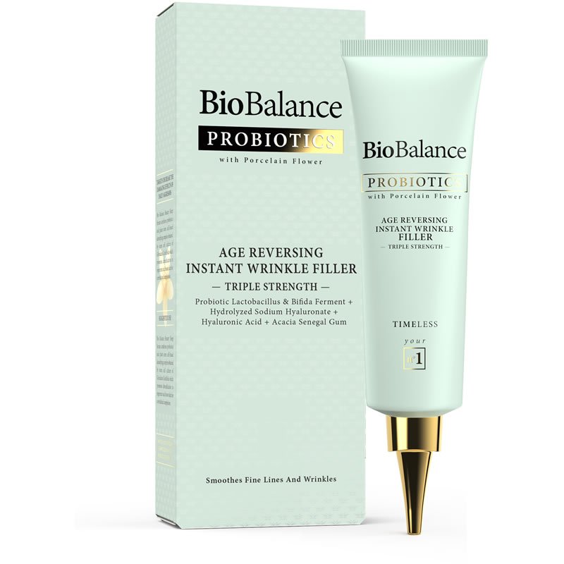 The triple strength BioBalance Probiotic Age Reversing Instant Wrinkle Filler delivers two types of Hyaluronic Acid and Acacia Senegal Gum, which instantly help smooth out fine lines and wrinkles and re-plumps them on the surface.