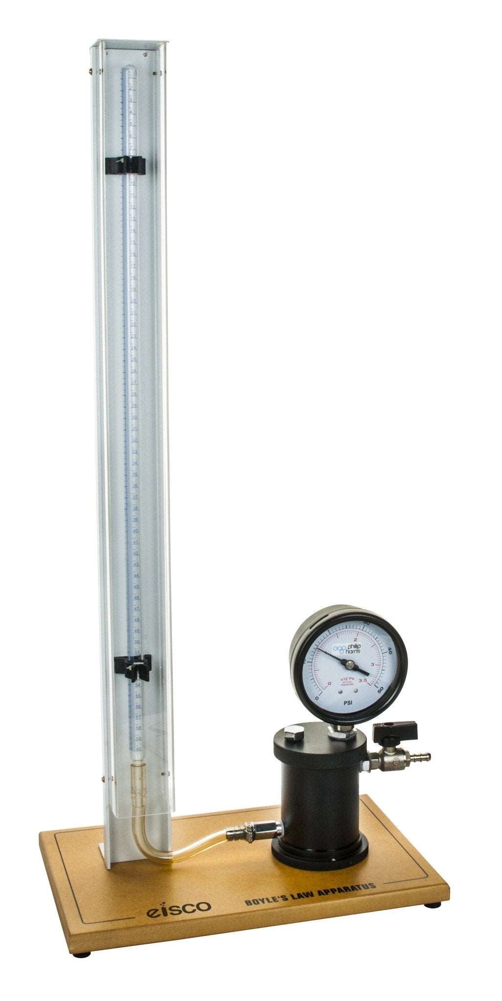Boyle's Law apparatus is ideally suited to demonstrate Boyle's Law. Colored Water or Oil is gradually pumped from a reservoir into a tube containing air. Whilst the volume of air is read from the graduated tube, pressure is measured by a Bourdon gauge.