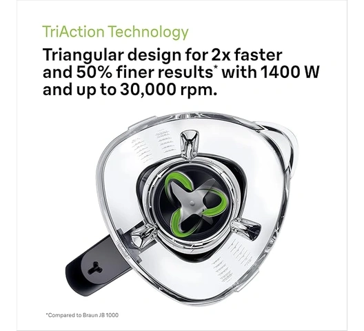 - TRI-ACTION TECHNOLOGY: blends all types of food; thanks to the triangular jug, there are no blind spots and the ingredients are returned faster to the mixing area