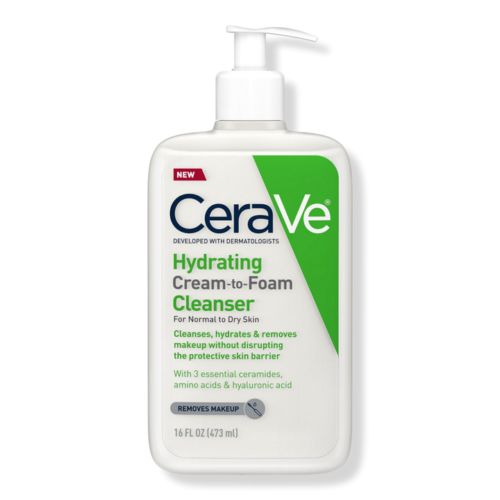 CeraVe Hydrating Cream-to-Foam Face Wash with Hyaluronic for Normal to Dry Skin removes oil and makeup while reinforcing the skin barrier with ceramides.