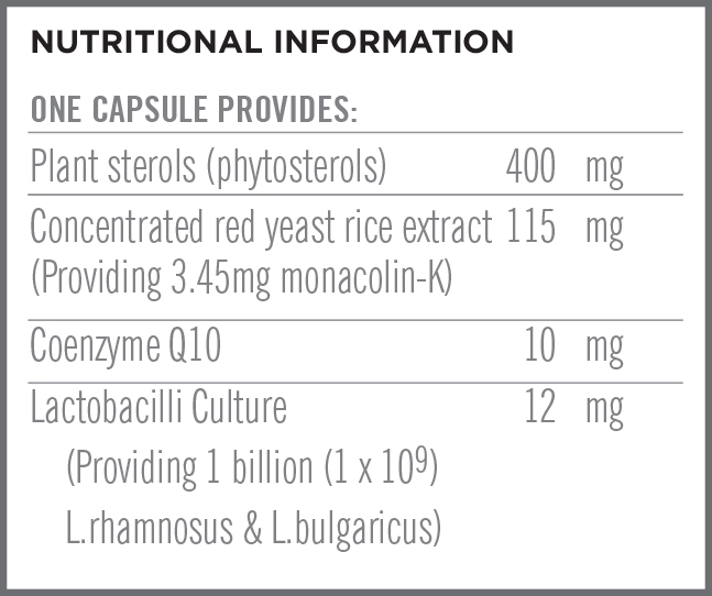 CholesterolBiotix is a unique formulation containing three natural-based cholesterol-lowering ingredients: plant sterols (phytosterols); red yeast rice extract (monascus purpureous), and lactobacilli probiotic bacteria. All three ingredients work in different ways to help support cholesterol levels naturally. Plant sterols inhibit the intestinal absorption of cholesterol; red yeast rice extract (containing monacolin-k) reduces the production of cholesterol by the body; and lactobacilli bacteria can remove cholesterol from the body. The formulation also includes CoQ10, which is recommended for patients on cholesterol lowering statins, such as monacolin-k contained in red yeast rice extract.