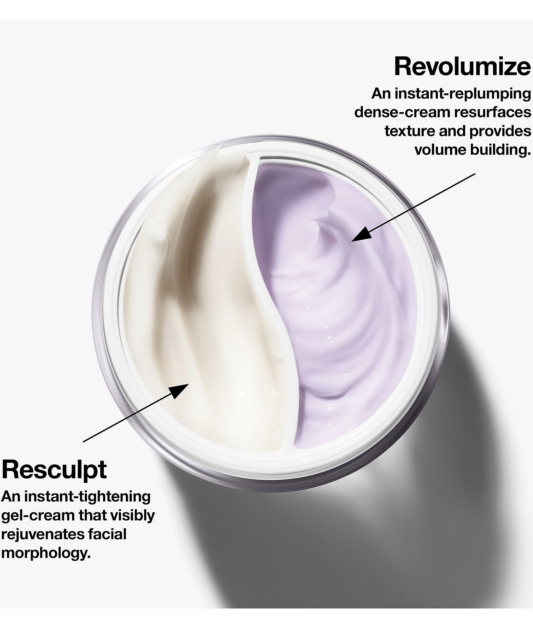 Two innovative moisturisers, one jar. Resculpts, volumises, and reshapes.