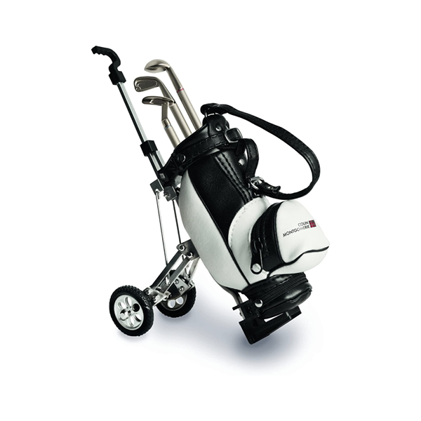Three golf club ballpoint pens including a putter, wood and iron, with blue, red, and black inks