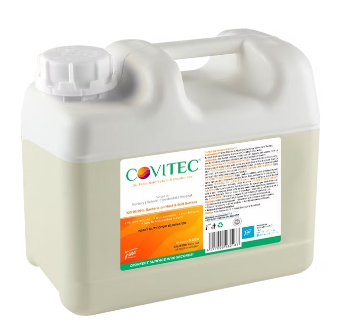 Surface Disinfectant & Deodorizer 5 Litre Covitec® is a registered disinfectant and odor eliminator, non-irritating on the skin, No rinse required for food contact surfaces with high safety profile for user and environment, kills 99.99% of bacteria in just 60 seconds.