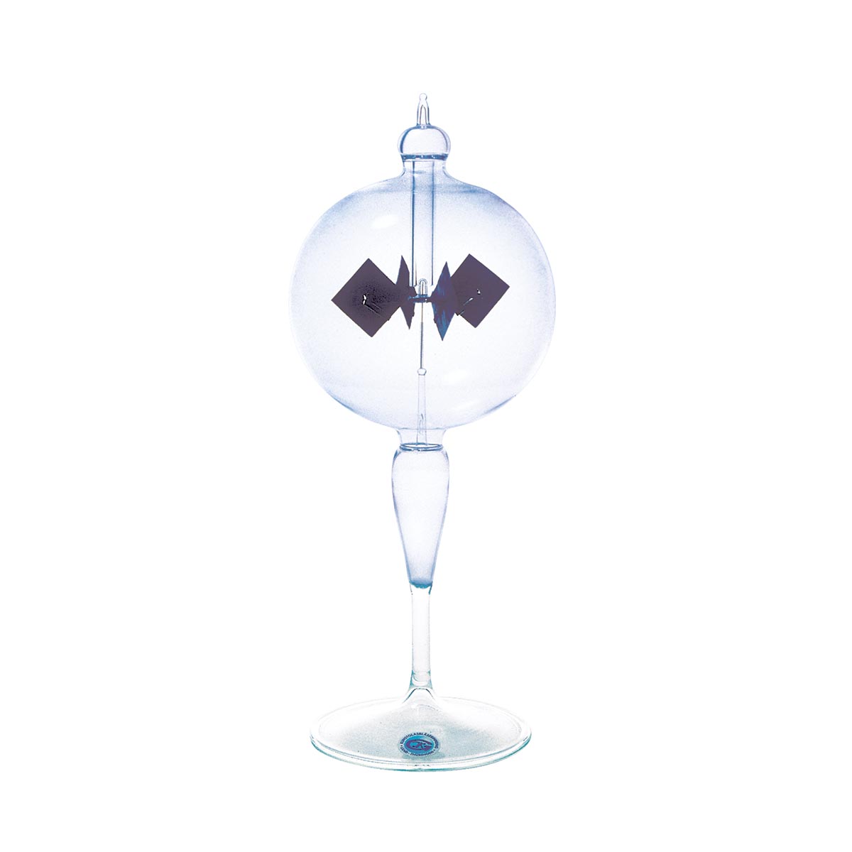 The Crookes radiometer (also known as a light mill) consists of an airtight glass bulb containing a partial vacuum, with a set of vanes which are mounted on a spindle inside.