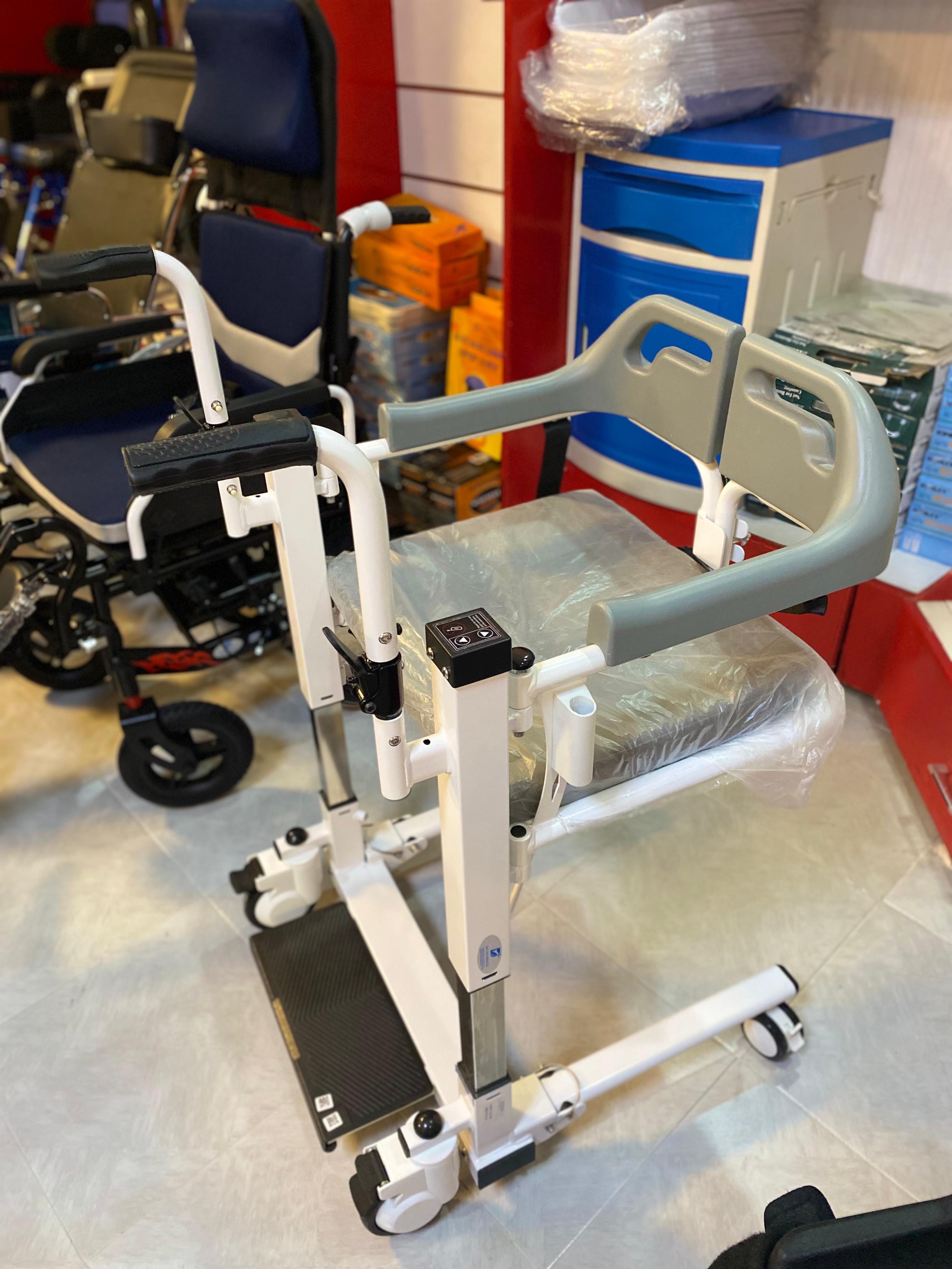 Compared with the previous model transfer chair, it is with remote to control the ascending and descending. the battery is 2.6AH, 24V, charging one time at 3 hours would be ok for 300 times working and it has 2 way of lifting up/ down. one is the remote control, the other is the built-in control.