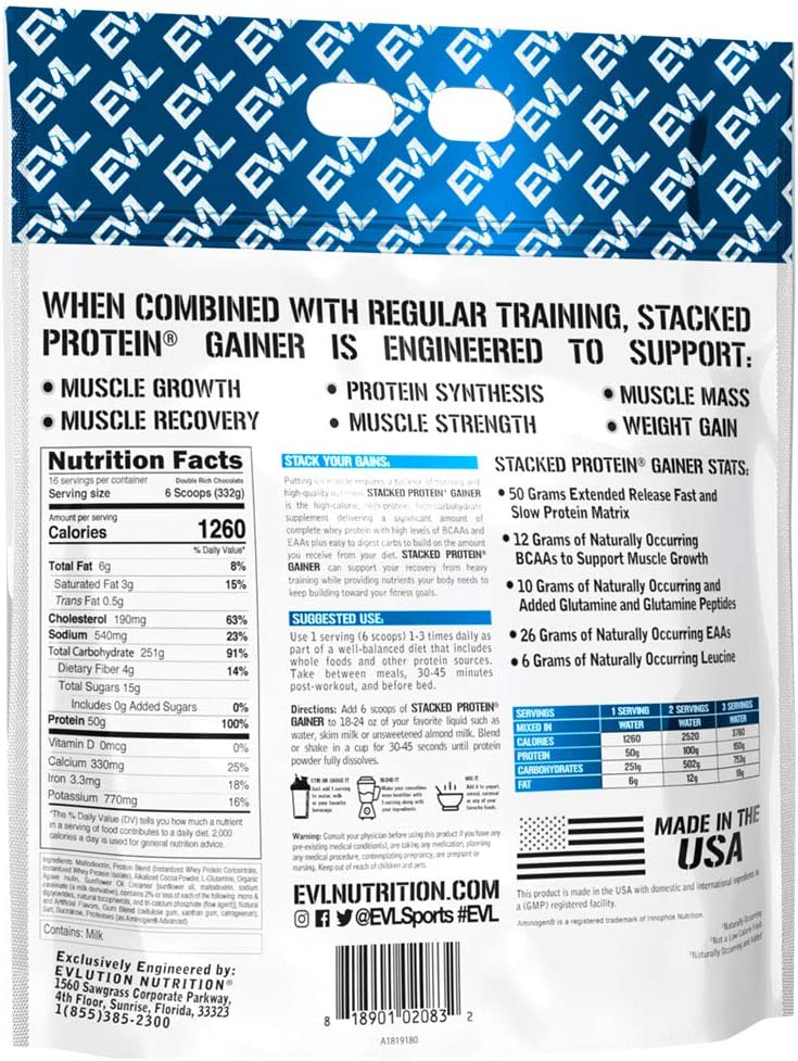 Achieving your biggest gains starts with stacking high protein and carbs to deliver maximum calories. Stacked Protein Gainer’s 50G of extended-release protein and 250G of quality carbs supplies 1250 calories to fuel your muscle gains. Packed with 26G of essential amino acids including 12G of BCAAs, it’s perfect post-workout to recover faster and stronger. Plus, its best in class ingredients and highest quality manufacturing ensure what you put inside creates better results outside!