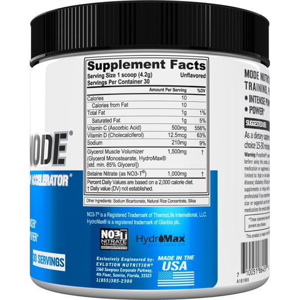 Warning: PumpMode is intended only for healthy adults above the age of 18. All individuals should consult a licensed healthcare practitioner before using this product. Consult your physician prior to using this product if you are taking any prescription or over-the-counter medication or supplements. Do not use this product if you are at risk or are being treated for any medical condition including, but not limited to: high or low blood pressure; cardiac arrhythmia; stroke; heart, liver, kidney or thyroid disease; seizure disorder; psychiatric disease; diabetes; difficulty urinating due to prostate enlargement or if you are taking a MAO inhibitor. The combined use of vasodilatory supplements or drugs and this product could cause an unsafe drop in blood pressure. Discontinue use and consult your healthcare professional if you experience any adverse reaction to this product. Keep out of reach of all children. Do not exceed recommended serving size or suggested use for any reason. Discontinue use 2 weeks prior to surgery. DO NOT USE if you are taking nitrates for chest pain, medications for erectile dysfunction (such as PDE-5 inhibitors), or other nitrate-containing dietary supplement. *These statements have not been evaluated by the Food and Drug Administration. This product is not intended to diagnose, treat, cure or prevent any disease.