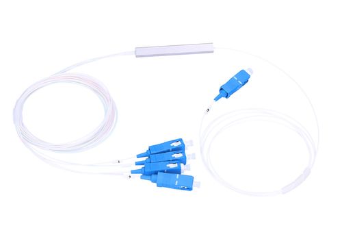 Splitter PLC with symmetrical 1:4 power distribution with both input and output connectors. The compact steel box housing enables easy installation in switches and fiber optic couplers.