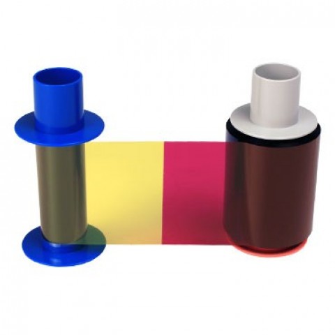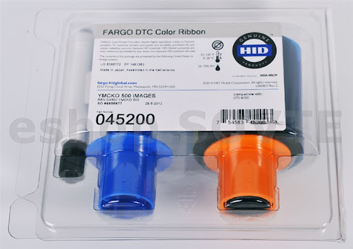 Fargo dtc4500e color ribbon prints full color plus black and overlay on the front, and black on the back of the card. Includes a card cleaning roller.