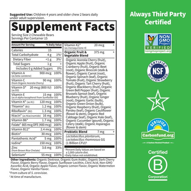Vitamin Code Kids multivitamin is a great-tasting chewable whole food, Non-GMO Project Verified multivitamin to support your child’s healthy development.† Made with Vitamin Code vitamins and minerals in a base of 25 family-farmed fruits and vegetables, Vitamin Code Kids supports your active, growing child by filling in those nutritional gaps.† Clean whole food ingredients are gently blended into a base of fruits and vegetables—and there are no artificial flavors, sweeteners, or additives.