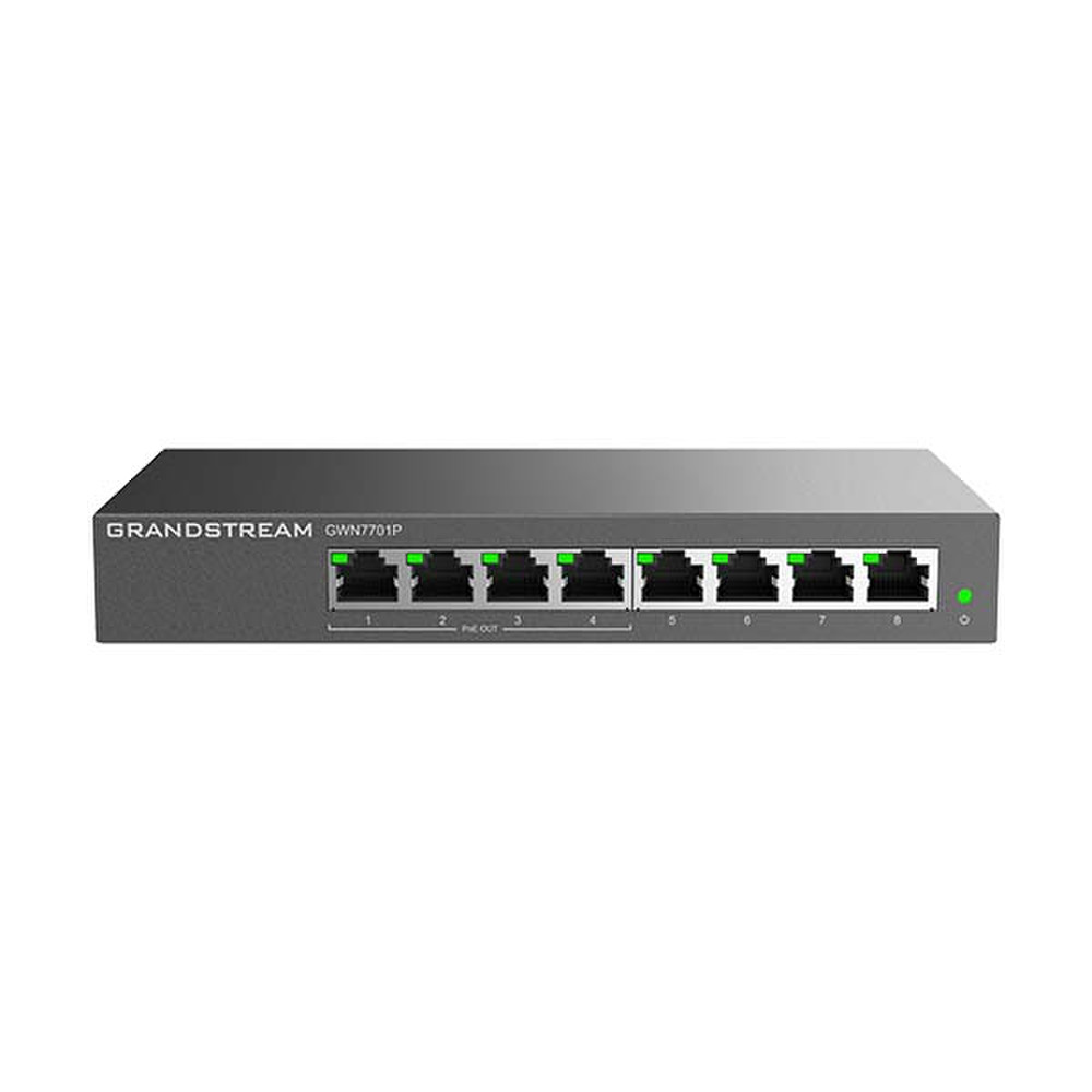 The Grandstream GWN7701P Unmanaged Network PoE Switch is an unmanaged network switch that provides a quick and cost-effective way to add high-speed Gigabit connectivity to home offices and small-to-medium-sized businesses. Part of the GWN7700 series of switches, the GWN7701P is a plug-and-play network switch that makes it quick and easy to deploy or expand any office communications and networking deployment. It requires no configuration or installation, offers a desktop and wall-mountable design, and provides auto MDI/MDIX to eliminate the need for crossover cables. Each port supports auto-negotiation to allow the GWN7701P series to recognize the link speed of any 10/100/1000Mbps network device and intelligently adjust it for compatibility and optimal performance. This PoE model provides ports with IEEE 802.3af/at compliant, smart dynamic PoE output to power IP phones, IP cameras, Wi-Fi access points, and other PoE endpoints