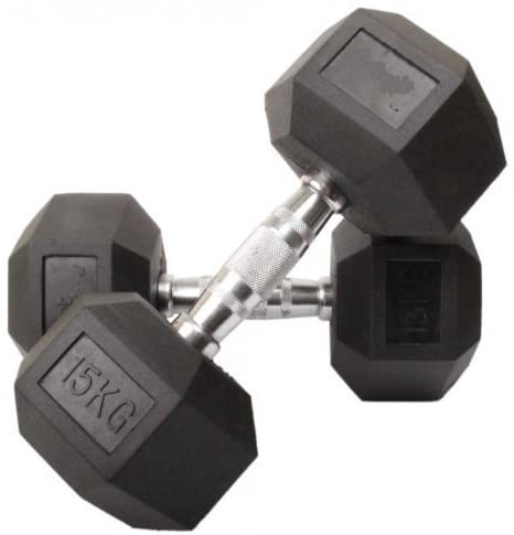 The kg rubber hex dumbbell incorporates rubber hex shaped ends to protect floors and surrounding equipment. This high-quality dumbbell is easy to clean and has an anti-roll construction that stops it from rolling away. It also features a chrome-plated knurled steel handle for a superb grip and torque threaded rubber heads that ensure permanent fixing to the handle. The dumbbell is suitable for light commercial usage only and it is sold as a pair.
