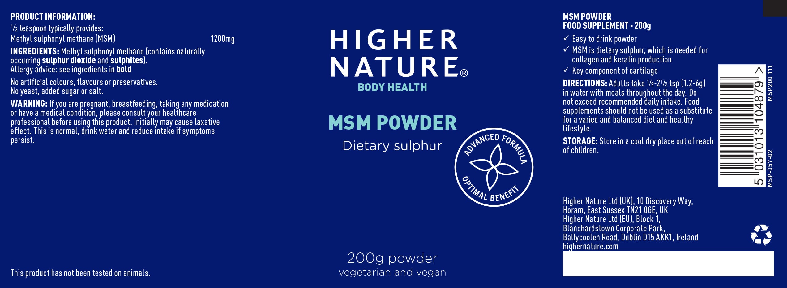 Encourage healthy skin, hair and nails with MSM Powder. This easily-dissolved powder is formulated with dietary sulphur, which is not only an important building block for cartilage in joints, but also for the production of collagen and keratin, which helps the growth of healthy hair, nails and skin. Ideal for those who don’t like to take tablets, this powder is odourless and free from artificial colours, preservatives and flavours.