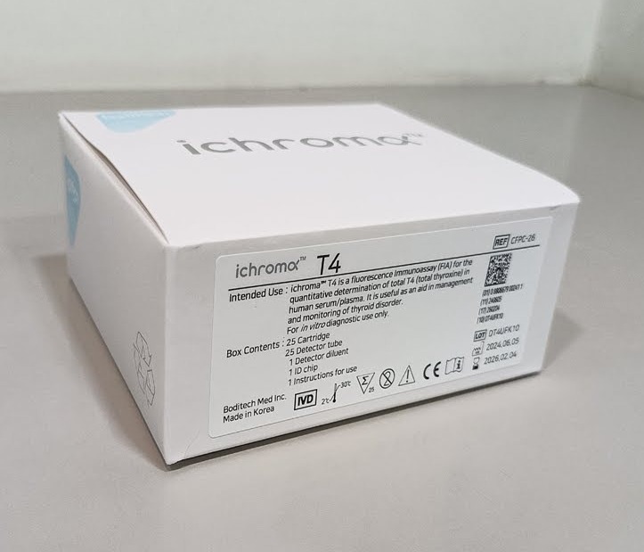 The iChroma T4 25Test Kit is a fluorescence immunoassay (FIA) diagnostic kit for quantitatively measuring total thyroxine in human serum or plasma to help diagnose and monitor thyroid disorders.