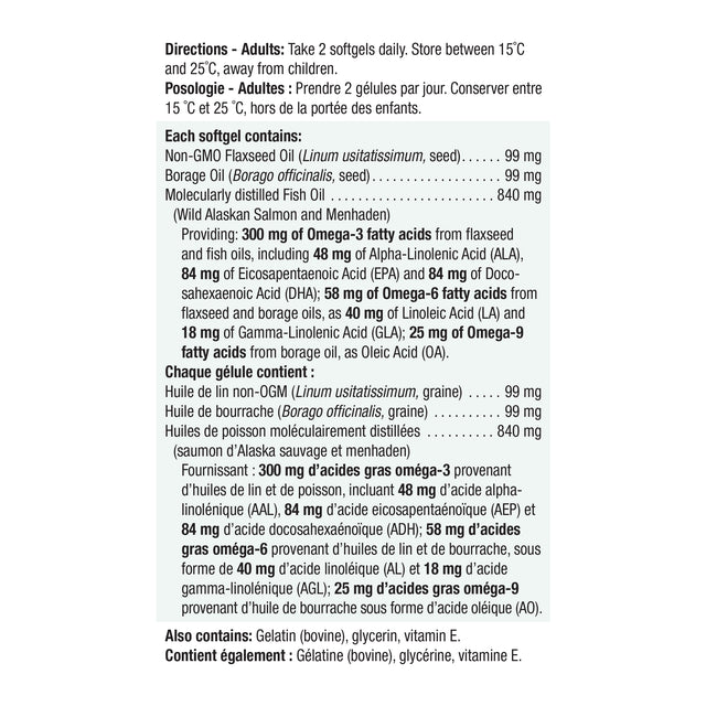 Jamieson Omega 3-6-9 is a complete source of omega-3, 6 and 9 essential fatty acids. Derived from fresh, pure cold-pressed oils of organic flax, borage and sustainably sourced fish, it helps to support heart health and maintain healthy cognitive function.