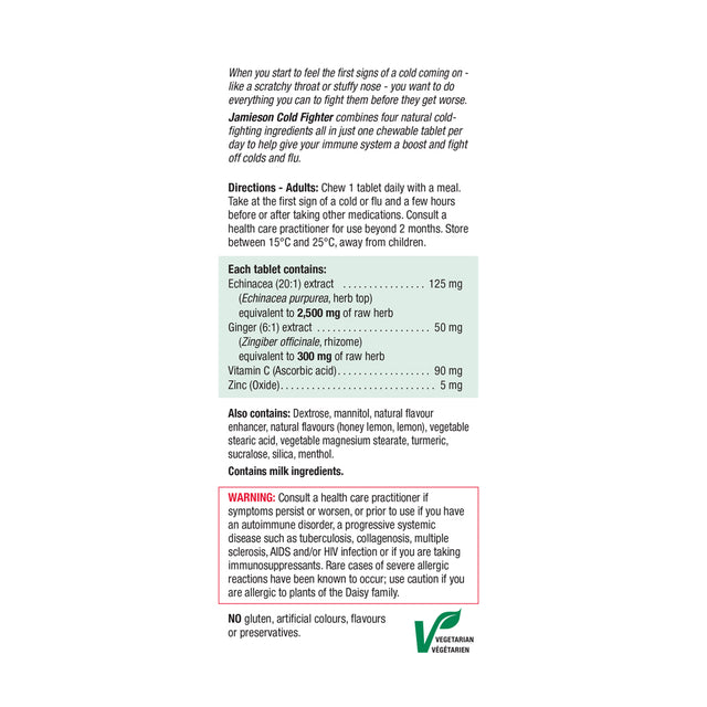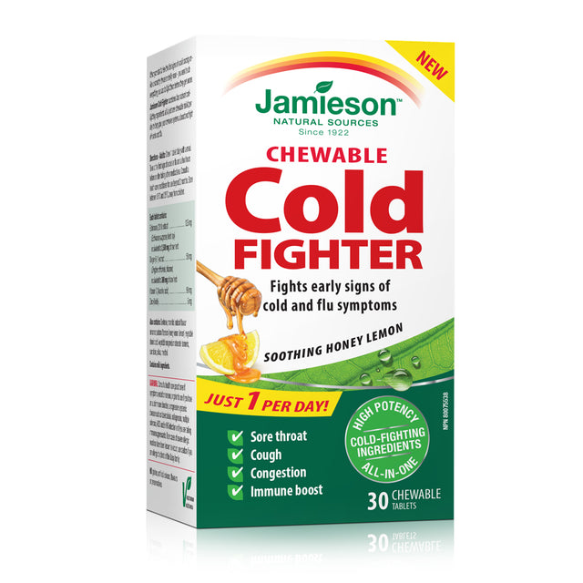 When you start to feel the first signs of a cold coming on - like a scratchy throat or stuffy nose - you want to do everything you can to fight them before they get worse. Jamieson Cold Fighter combines four natural cold fighting ingredients, all in just one chewable tablet per day, to help give your immune system a boost and fight off colds and flu.