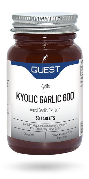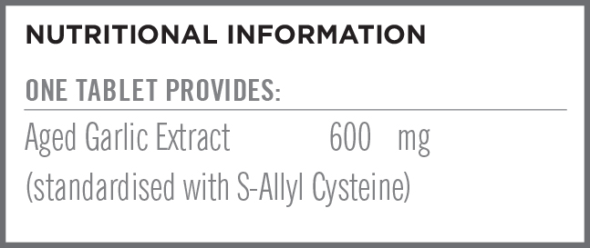Aged garlic contributes to normal heart, liver and immune function. Kyolic garlic is produced from organically grown cloves cold aged for 20 months to produce sulphur containing compounds including s-allyl cysteine and S-allyl mercaptocysteine. Shown to lower total and LDL blood cholesterol, improve blood circulation, support healthy blood pressure levels, reduce platelet aggregation and adhesion to blood vessel walls. Aged garlic also has antioxidant actions to enhance immune function, reducing the risk and duration of infections and protecting cells from oxidative damage by free radicals. It also enhances the activity of liver enzymes to assist detoxification pathways.