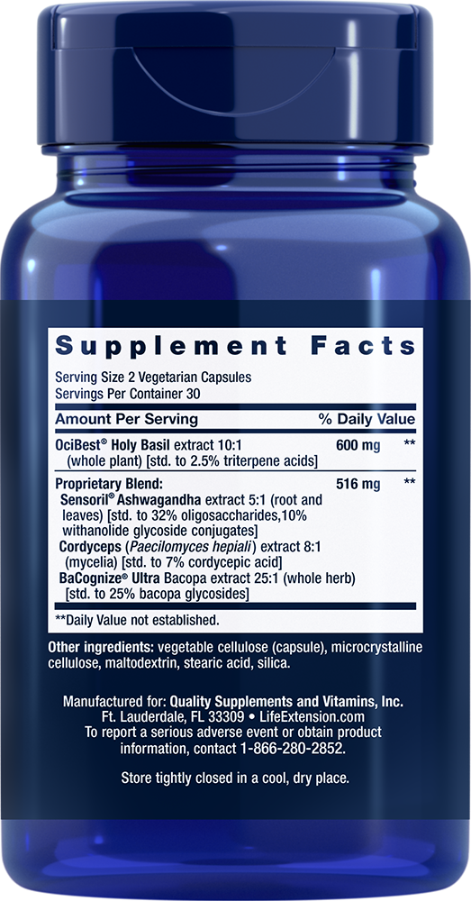 Active compounds from holy basil, cordyceps, bacopa and ashwagandha support a healthy response to stress.