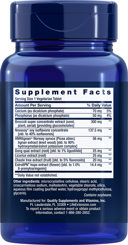 Estrogen for Women is a plant-based formula designed to support against menopausal discomforts and support healthy estrogen metabolism. It delivers soy isoflavones and potent botanicals such as concentrated hops extract, broccoli, licorice and chasteberry extracts, dong quai and more, all in just a single tablet.