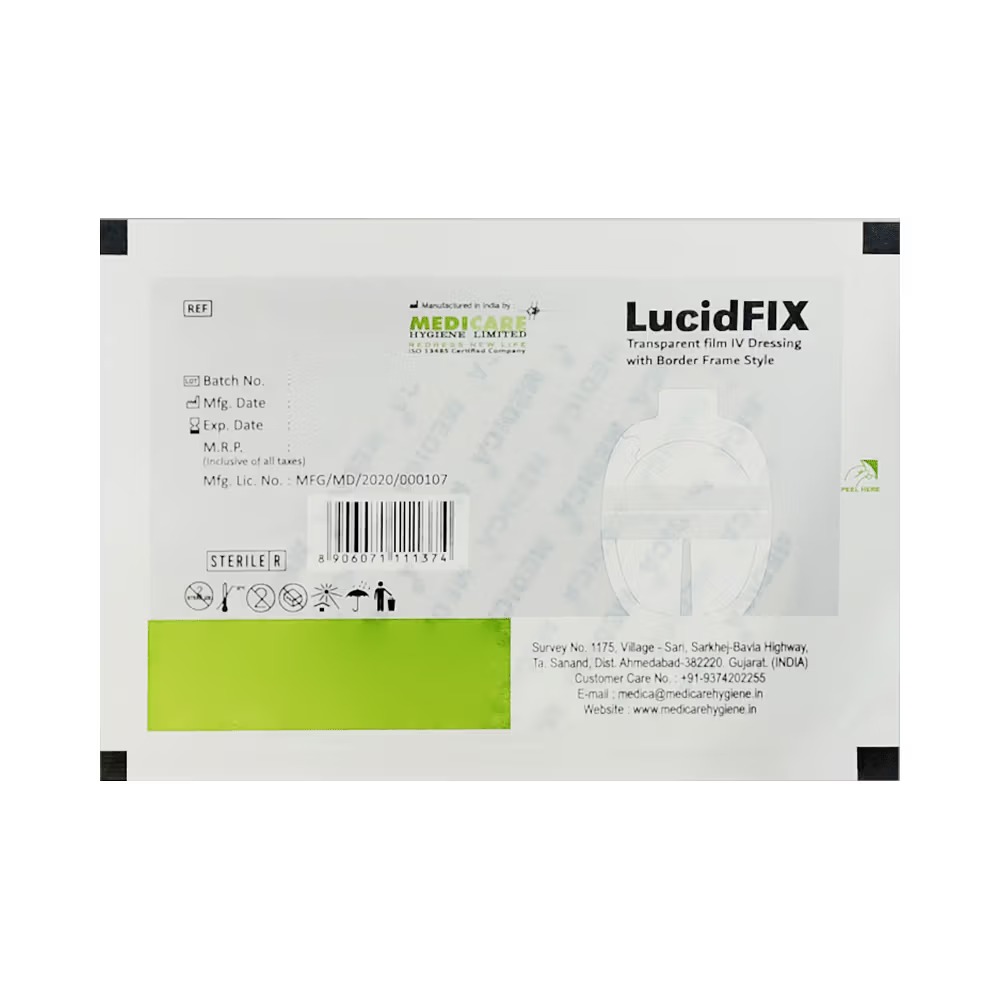 Medicare Lucidfix Transparent Film IV Dressing with Border is a medical product used for wound care and specifically designed for intravenous (IV) dressings.