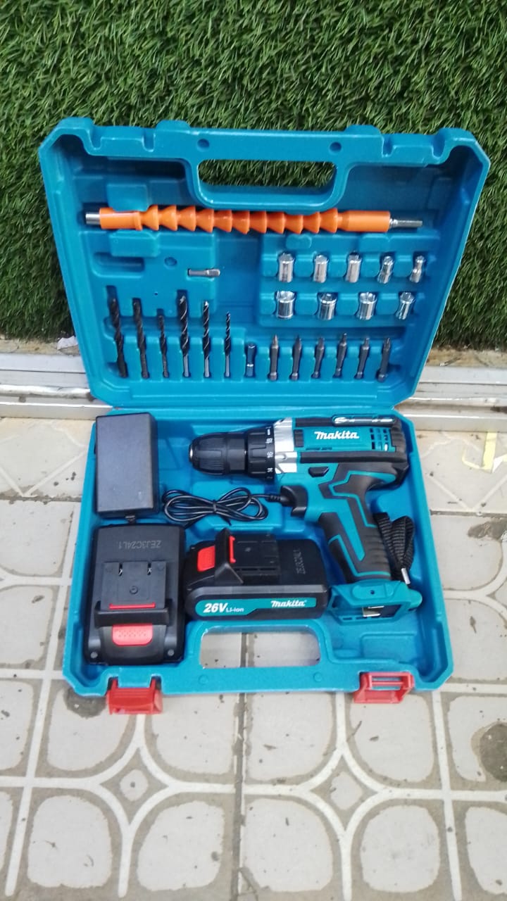 - Features: Includes a 26V cordless drill, two batteries, a charger, and various drill bits and accessories in a blow case.