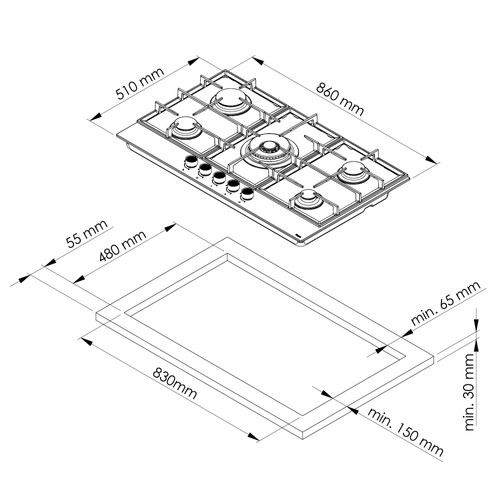 MIKA Built-In Gas Hob, 90cm, 5 Gas with 2 WOK, ALUMINIUM SABAF Burner, Grey Glass
