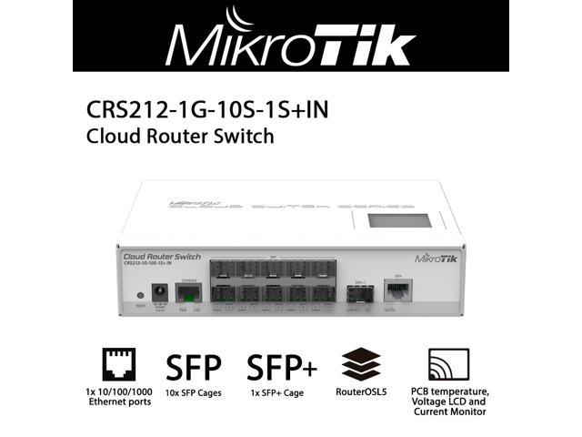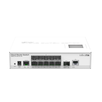 Cloud Router Switch 212-1G-10S-1S+IN is new “small size low cost” member of our CRS series. It comes with one Gigabit Ethernet RJ45 port, ten SFP cages and one 10G SFP+ cage, as well as LCD panel and serial port (RJ45). Product includes indoor desktop case and power supply. Special ears are provided for mounting the unit in rack.