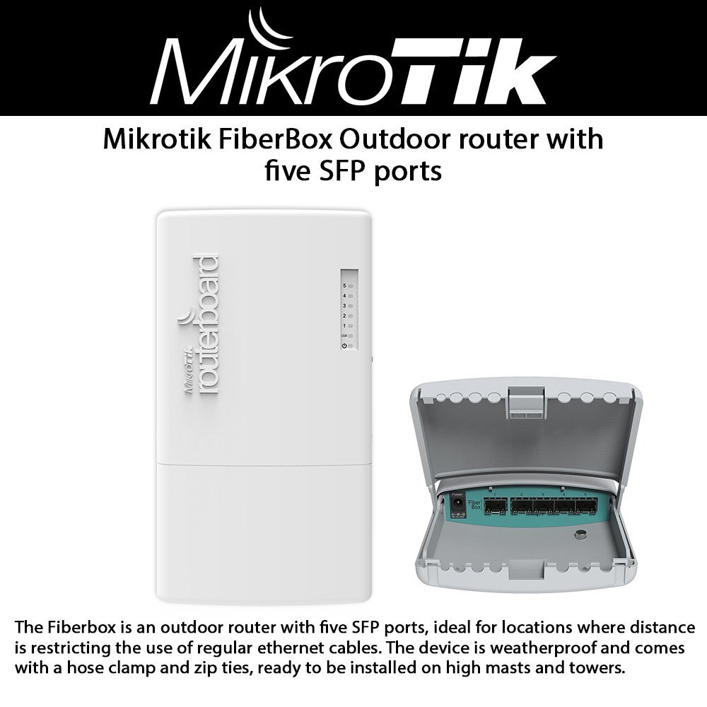 The FiberBox is an outdoor router with five SFP ports, ideal for locations where distance is restricting the use of regular Ethernet cables. The device is weatherproof and comes with a hose clamp and zip ties, ready to be installed on high masts and towers.