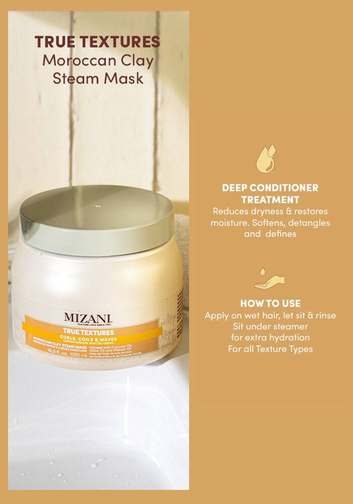 Formulated with Moroccan Lava Clay, an age-old remedy for both hair and skin, the True Textures Moroccan Clay Steam Mask nourishes, detangles, and defines your natural hair texture.