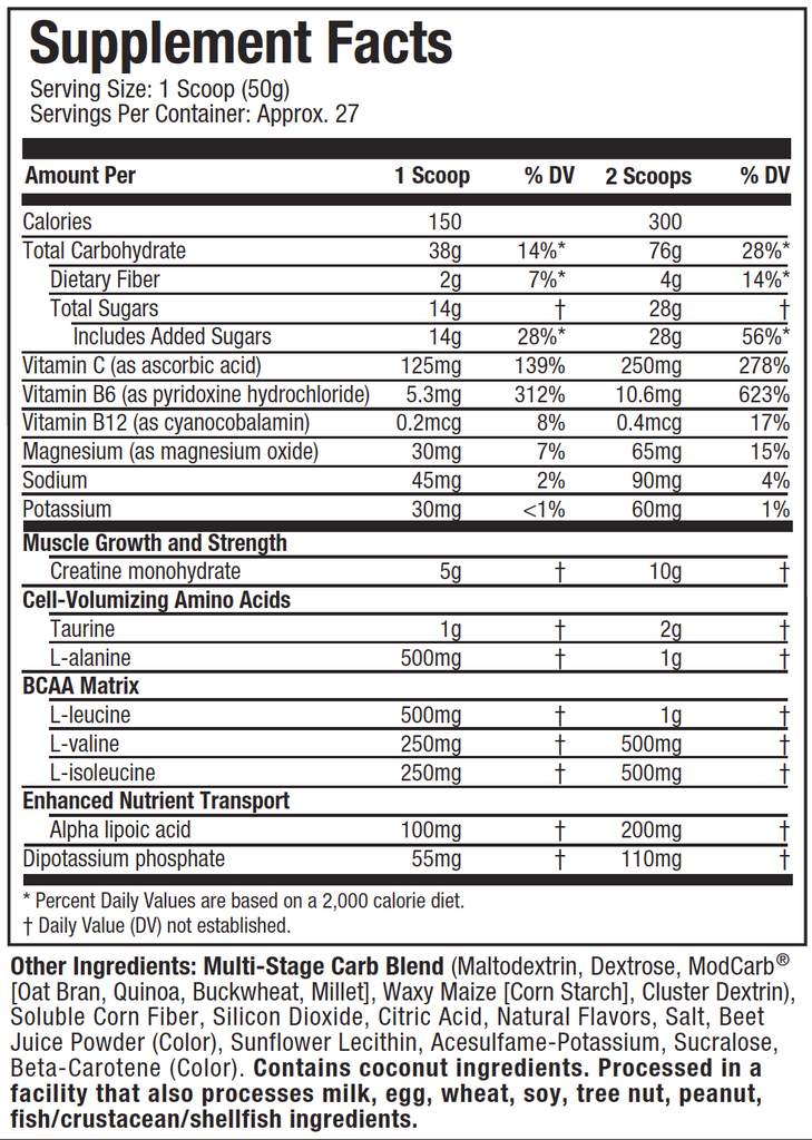 Multi-stage carb blend (glucose polymers, dextrose, ModCarb™ [oat bran, quinoa, buckwheat, millet], waxy maize [corn starch], cluster dextrin), soluble corn fiber, silicon dioxide, citric acid, natural and artificial flavors, salt, sunflower lecithin, acesulfame-potassium, sucralose, fd&c red no 40.