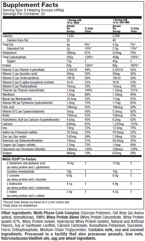 MASS-TECH® EXTREME 2000 delivers more protein per serving than most other mass gainers available on the market. With a whopping 80g of premium protein (when mixed with 20 oz. of skim milk), your body will have all the building blocks it needs to build the size and muscle you’re looking for. In addition, unlike many other mass gainer formulas, MASS-TECH EXTREME 2000 contains only high-quality, milk-derived protein sources with the highest biological value.