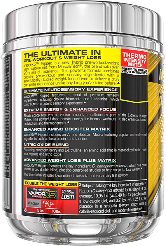 - PRE WORKOUT plus WEIGHT LOSS – Vapor X5 Ripped is a new, hybrid pre-workout / weight loss supplement. This formula combines popular pre workout and sensory ingredients with a scientifically studied weight loss driver to deliver a truly complete experience