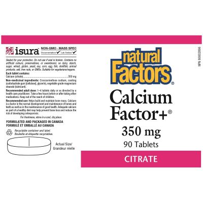 Natural Factors Calcium Factor + provides 350 mg of elemental calcium per tablet. Calcium is an abundant mineral that is important for the normal development and maintenance of bones and teeth. The citrate form is readily absorbed and is ideal for those with sensitive digestive systems.