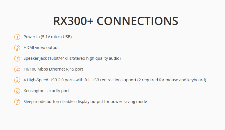 Peripheral Support: • 4x USB 2.0 high-speed ports (two required for keyboard & mouse), All USB ports provide full USB redirection, utilizing device drivers from the server.