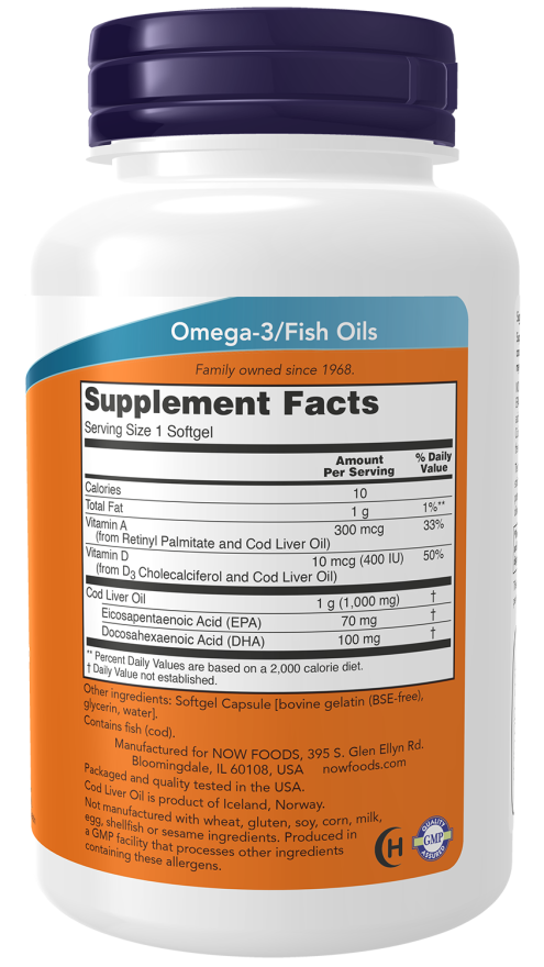 NOW® Cod Liver Oil abounds in omega-3 fatty acids, EPA (eicosapentaenoic acid) and DHA (docosahexaenoic acid). It is also an excellent source of vitamins A and D-3. Cod liver oil has a long history of traditional use for the support of overall health and well-being.*