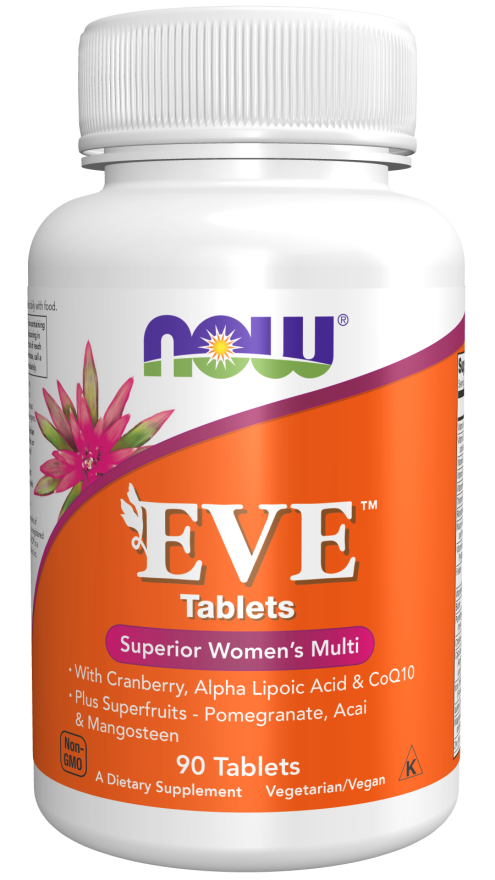 NOW EVE™ Tablets are specially formulated for the vitamin needs of adult women, featuring cranberry, alpha lipoic acid, CoQ10, superfruits, and more. This unique formula has 100% of the recommended daily value of iron, using Ferrochel™, a non-constipating form of iron.