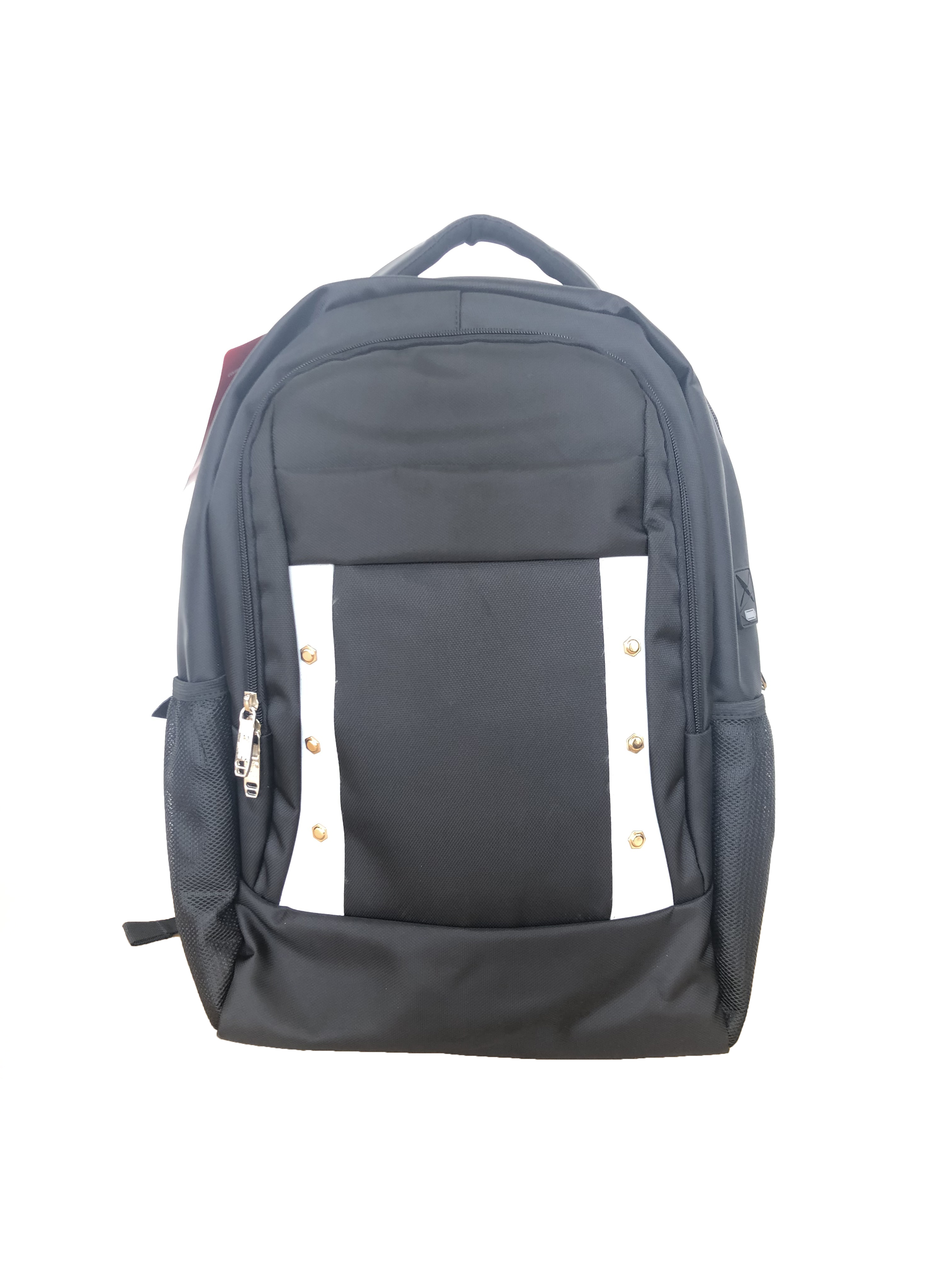 This laptop bag is a stylish bag designed with silver front sided strips and a 3 sided golden button design.