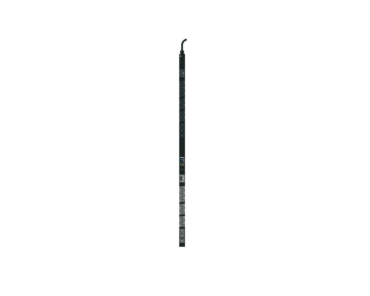 SmartZone™ G5 Monitored Input (MI Series) Rack PDU, 32 A Single Phase, 230V, (28) C13 and (6) C19) receptacles, IEC 60309 2P+E 6h 32A plug and measures 68.898"L x 2.047"W x 2.1"D (1750.1mm x 50.8mm x 53.3mm). Color: Black